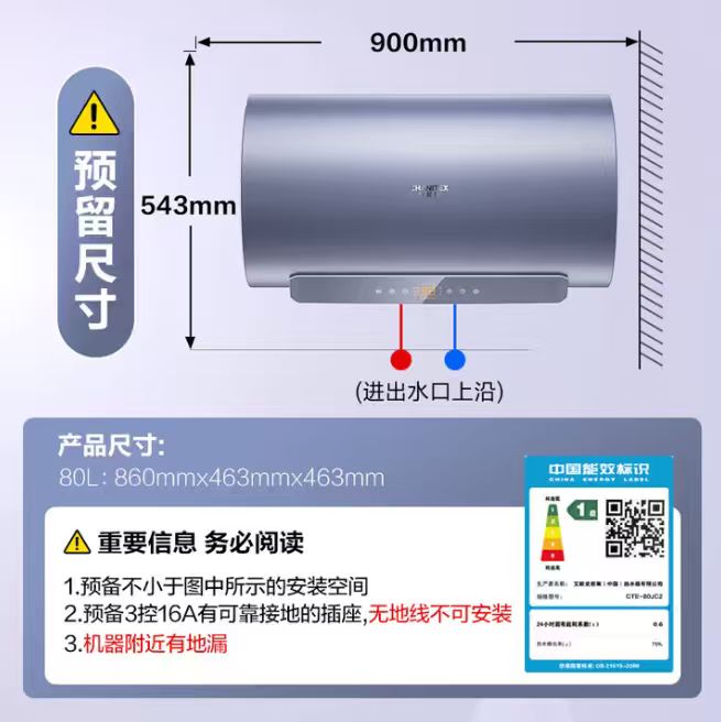史密斯(A.O.SMITH)国家补贴20%佳尼特电热水器60升专利免清洗双棒双3kW速热便携遥控节能家用洗澡一级能效JC2 80L 3000W 大水量 源头净水亲肤