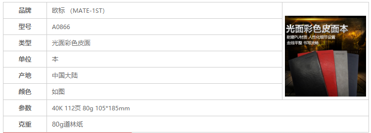 品牌:MATE-1ST/欧标;所属分类:皮面笔记本;尺寸:105*185mm;规格:40K;类型:光面彩色皮面;型号:A0866