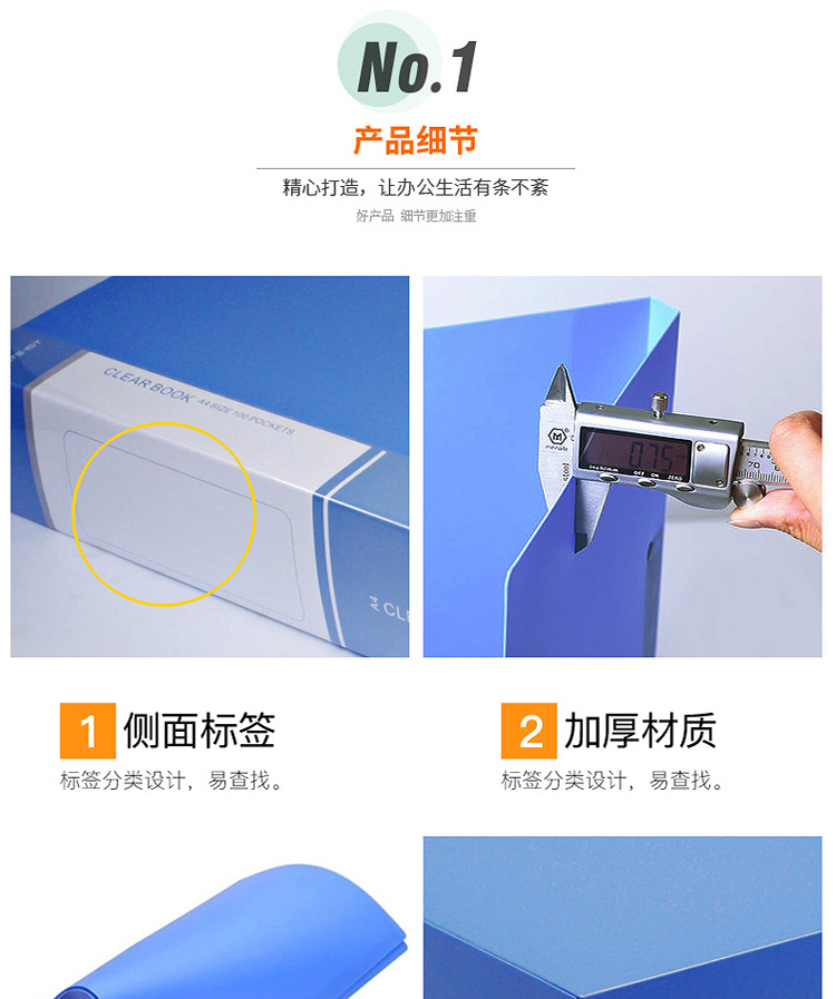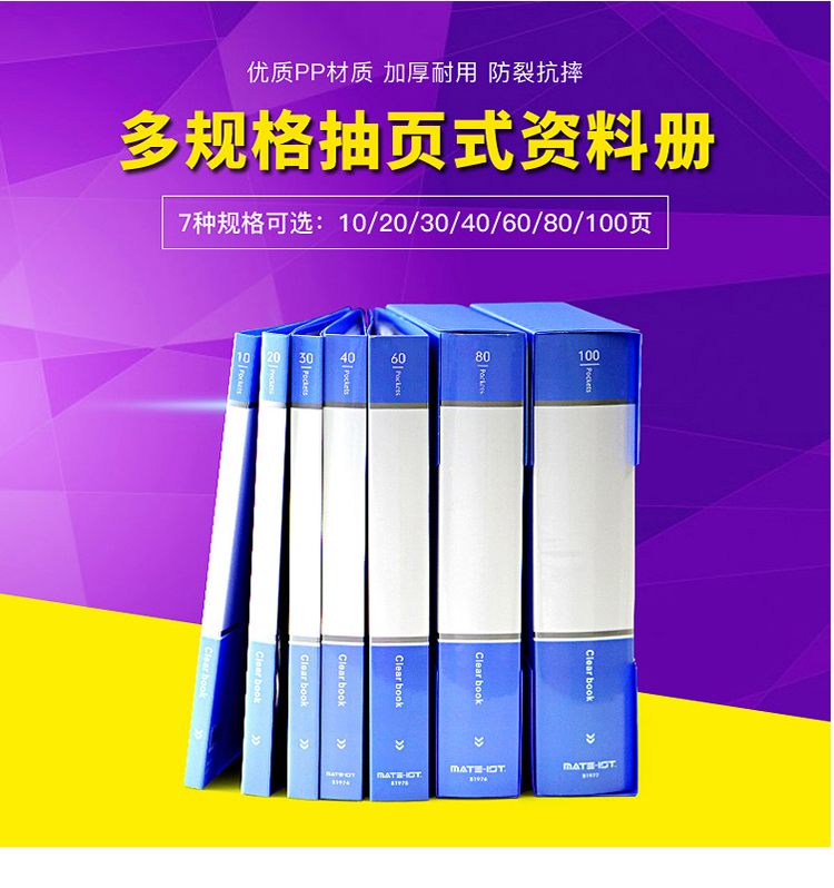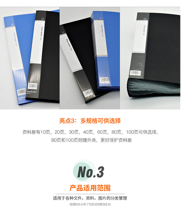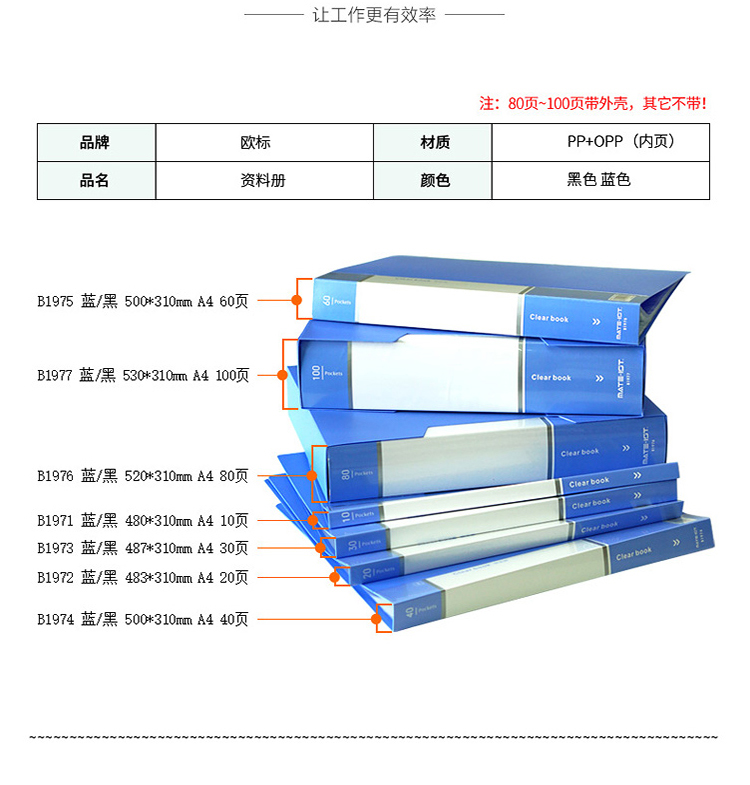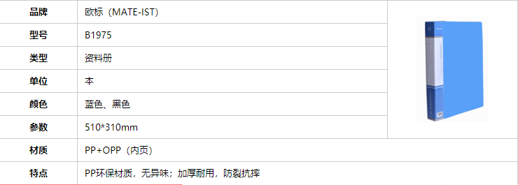 品牌:MATE-1ST/欧标;所属分类:资料册;型号:B1975;尺寸:500*310mm;颜色:蓝色、黑色;材质:PP OPP(内页);参数:A4 60页
