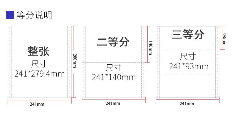 黄金搭档打印纸 241-3彩1/2 三联二等分 撕边1000页 彩色
