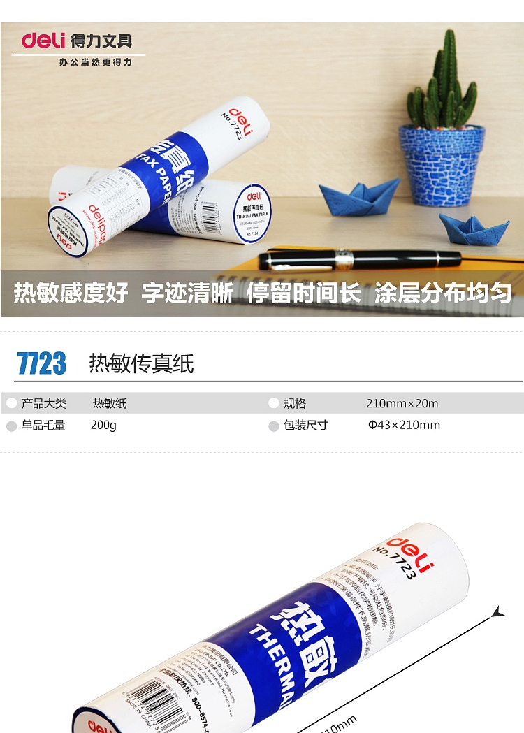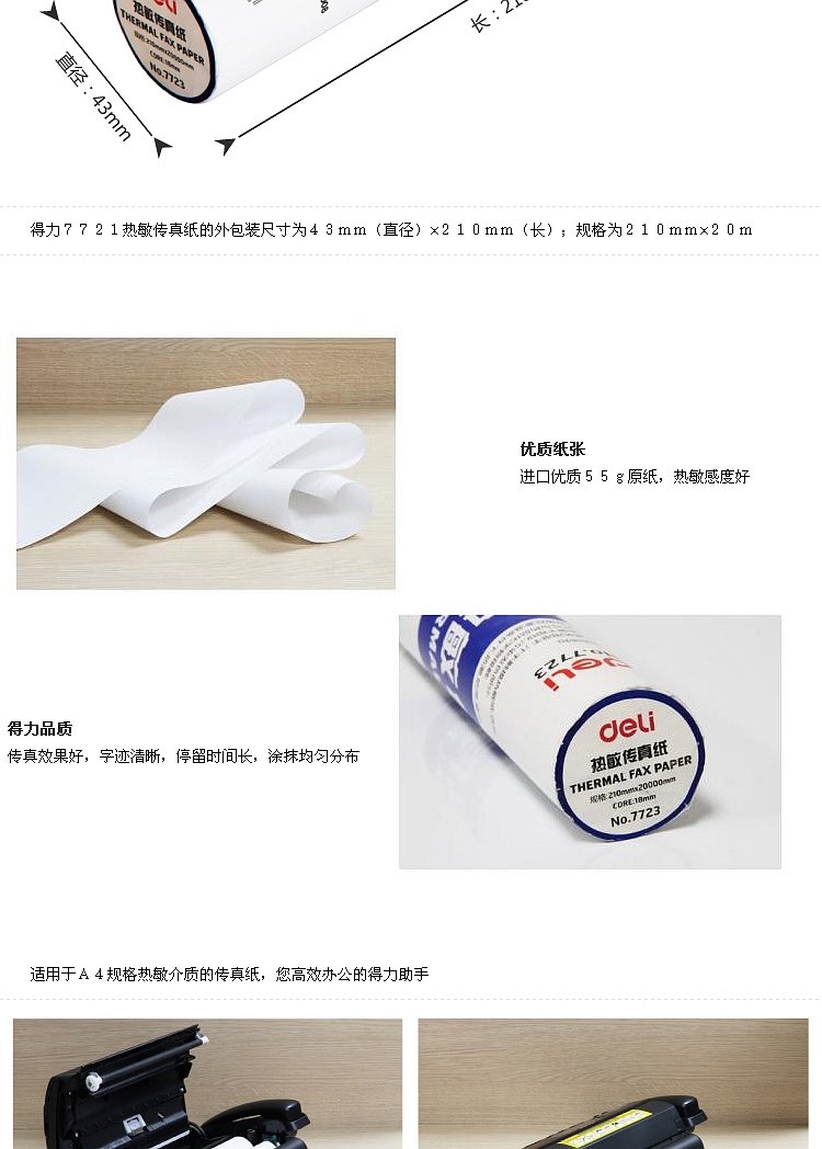 得力7723热敏传真纸(白)210mm*19m(卷)
