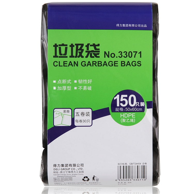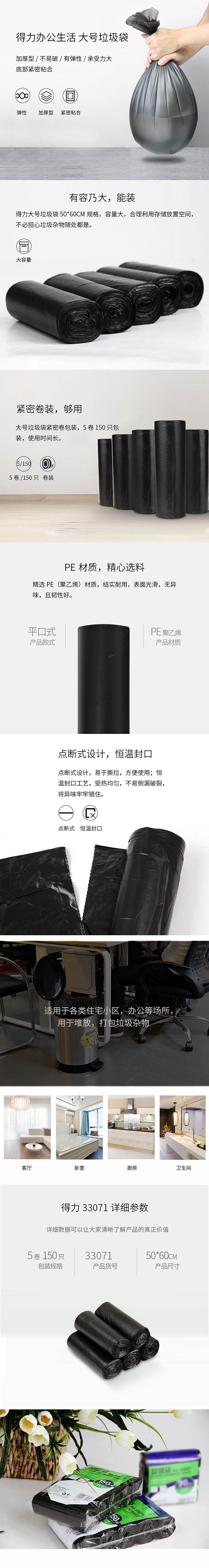 品牌:得力; 名称:垃圾袋; 型号:33071; 规格:50*60*0.001cm; 材质:PE; 颜色:黑