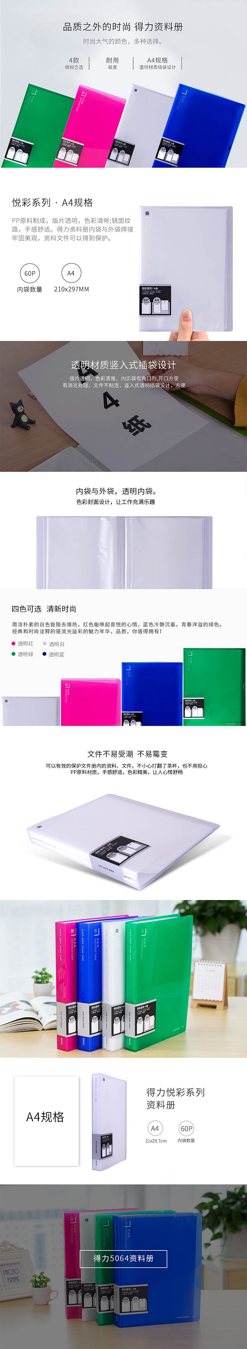 品牌:得力; 名称:资料册; 型号:5064; 规格:A4; 板材厚度:0.9; 包装:1个/包; 颜色:透明绿