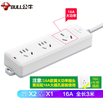 公牛(BULL)GN-405D 大功率16A插座/插线板/插排/排插/接线板 3位无开关全长3米大功率16A插座