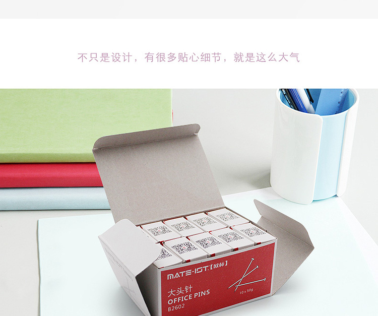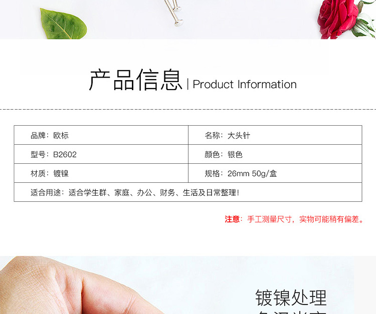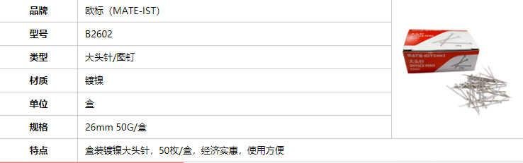品牌:欧标(MATE-1ST);所属分类:大头钉、图钉;材质:镀镍;规格:50G/盒;颜色:银色;尺寸:26mm;类型:大头针;型号:B2602
