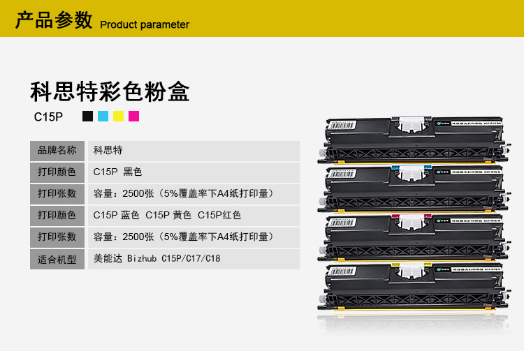 品牌:科思特;型号:C15P蓝;支数:1;颜色:青色(蓝色);打印量:2500;适用机型:Konica Minolta Bizhub C15P/C17/C18