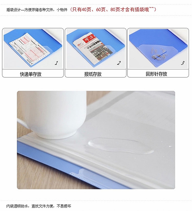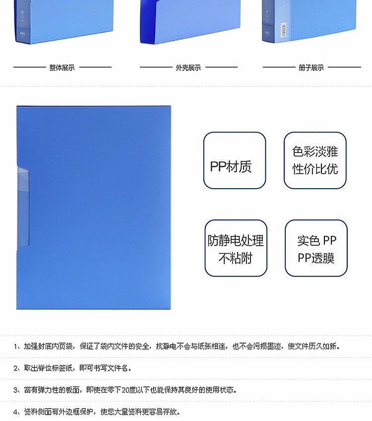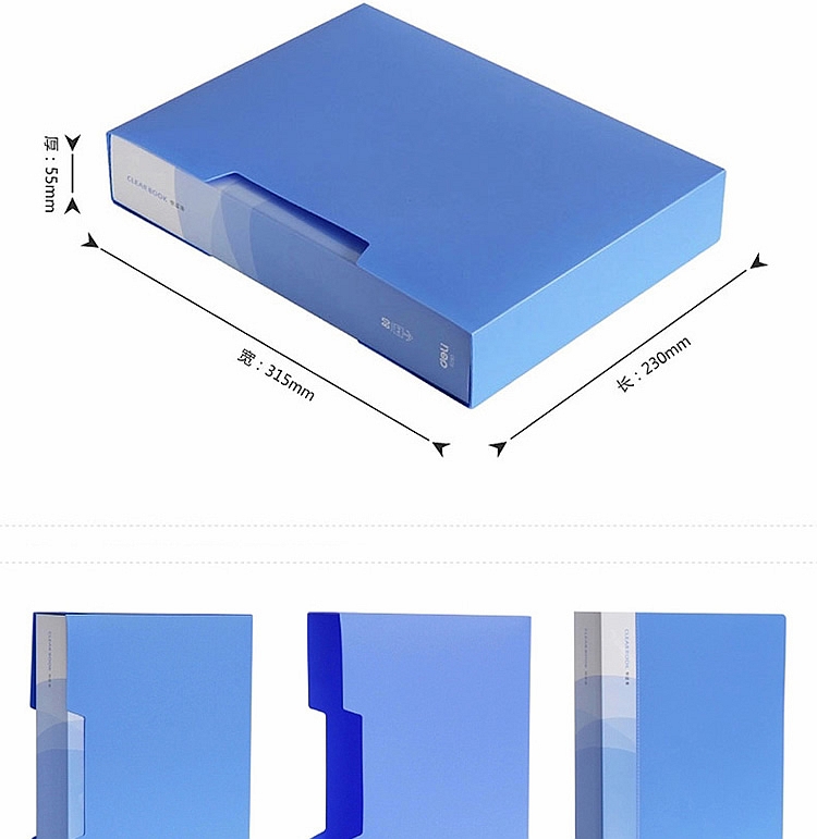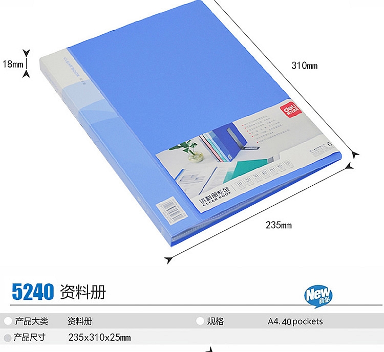产品规格:235x310x24mm;外箱尺寸:52.5x41.5x35.5cm;包装数量:1/12/48;纸张尺寸:A4;板材厚度:0.95mm;可装数量:40页