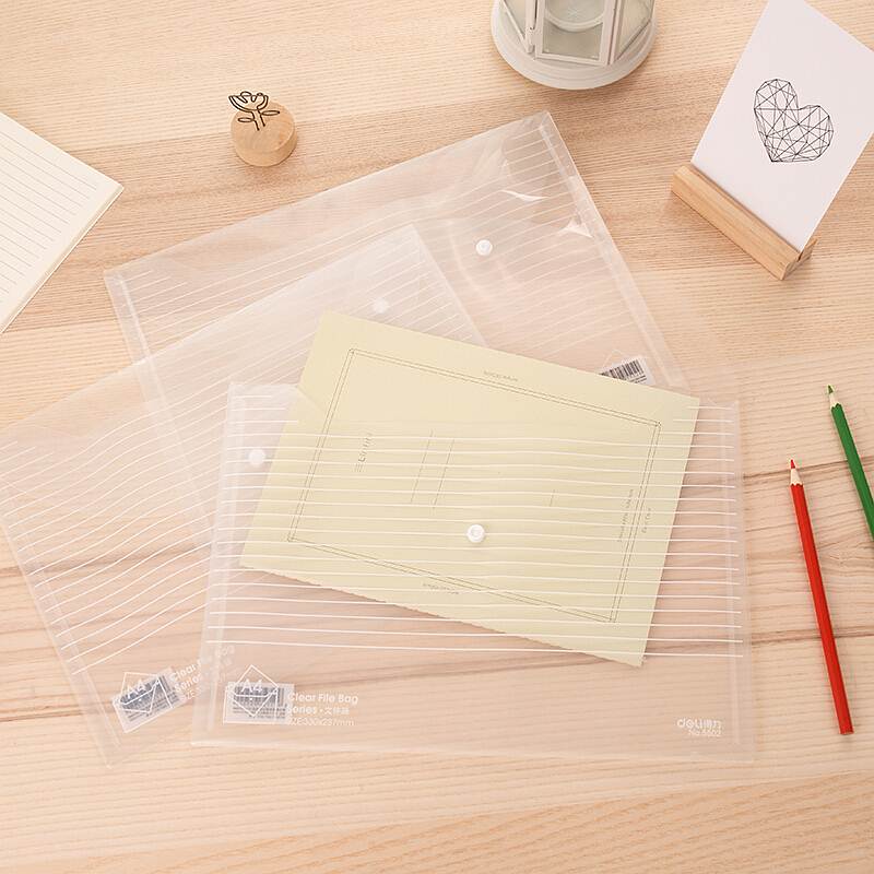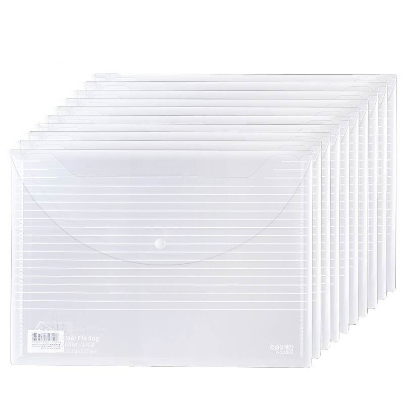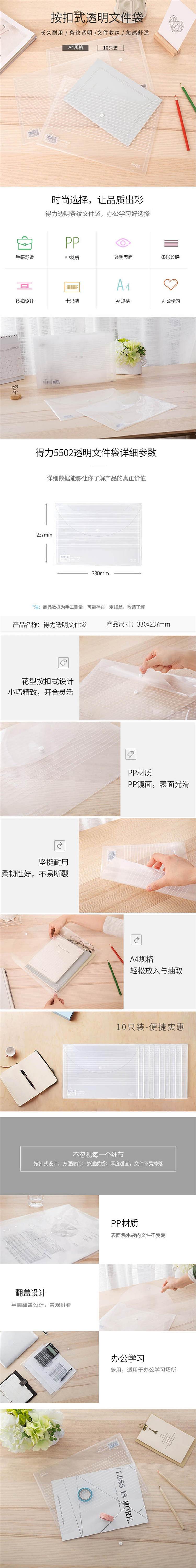 品牌:得力;名称:文件袋;型号:5502;规格:A4;板材厚度:0.18mm;包装:1只;颜色:透明
