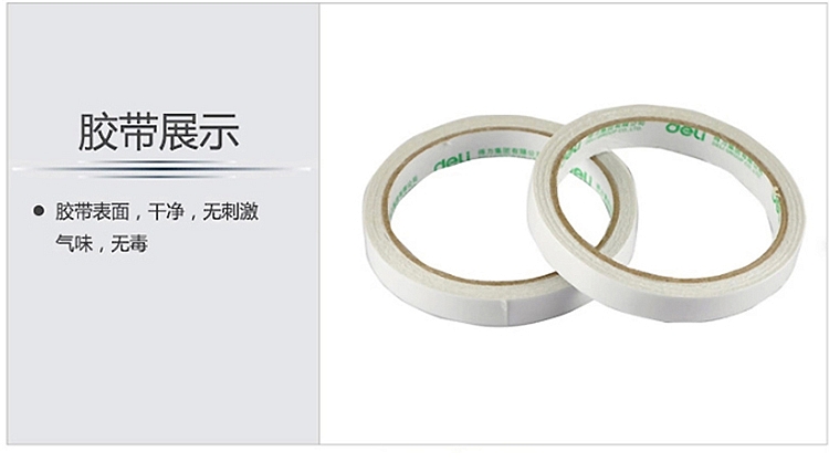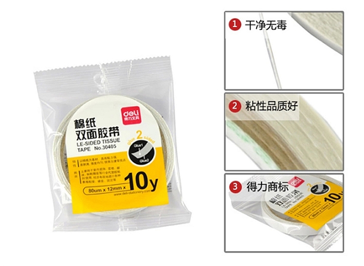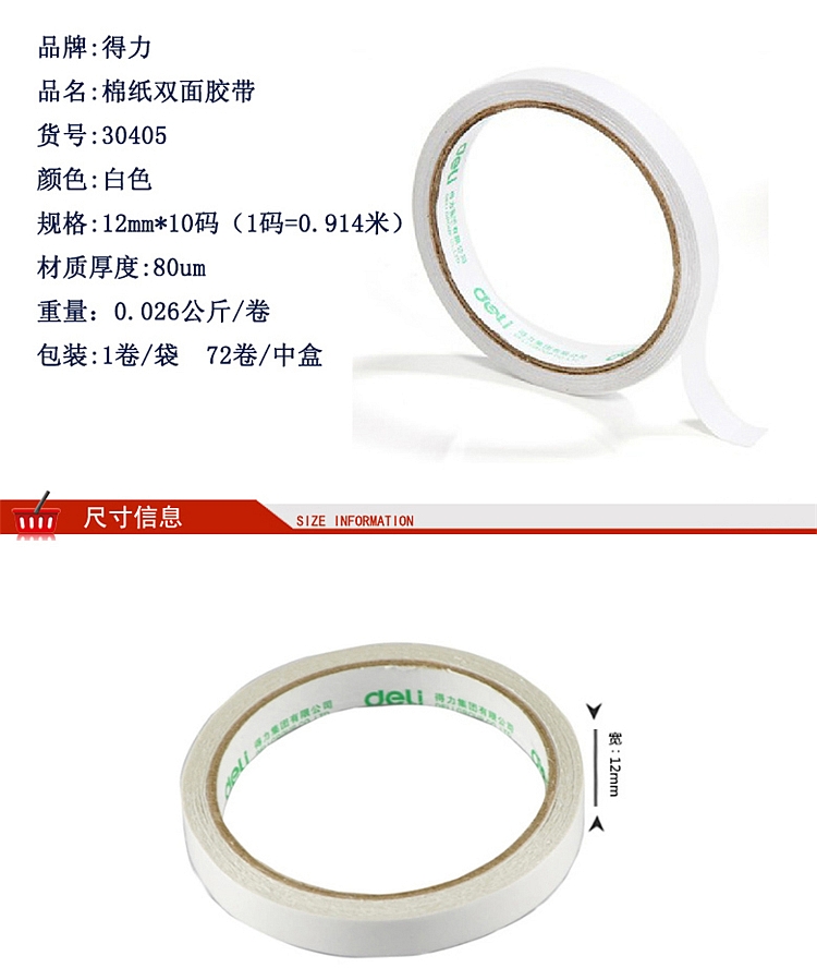 得力30405棉纸双面胶带12mm*10y*80um(白)(1卷/袋)
