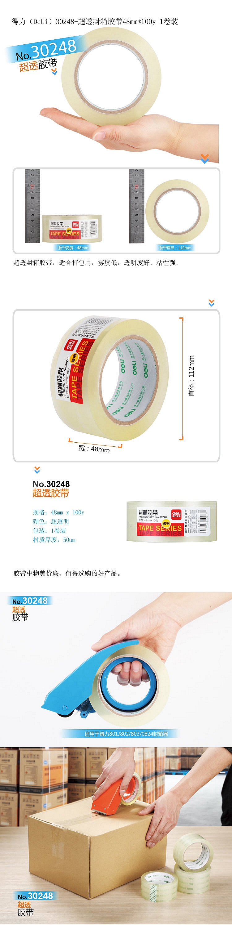 产品规格:48mmx100y;产品包装:1卷/筒--48筒/箱;外箱尺寸:47x24.5x32.5cm;材质厚度:50um